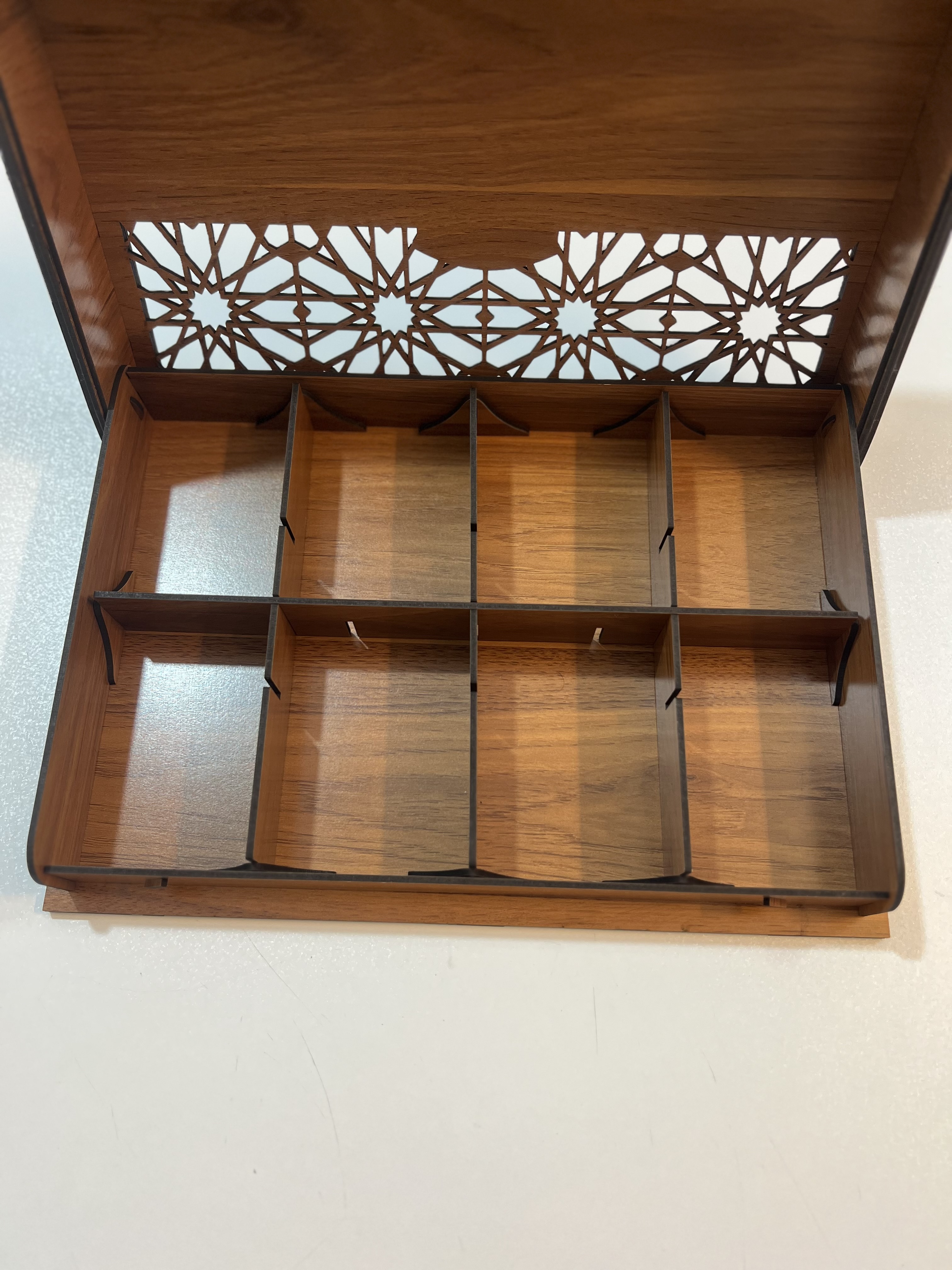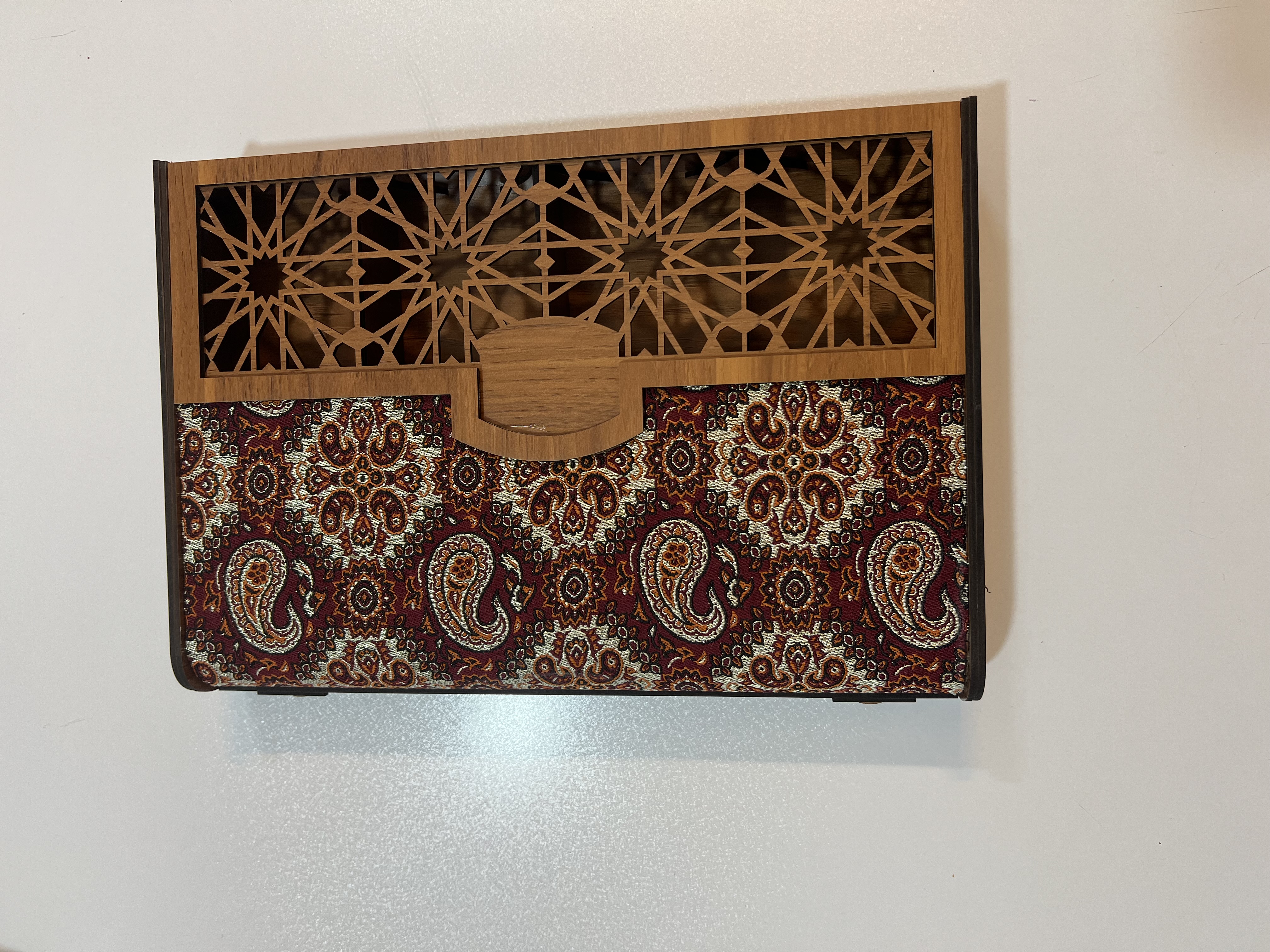 جعبه چوبی که با ترمه ترکیب شده و خیلی شیک و خاص شده و برای مصارف گوناگون قابل استفاده هست مثل جای دمنوش و یا برای بسته بندی گز و بسته بندی آجیل و خشکبار ☺️